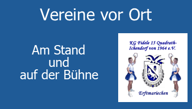Für das leibliche Wohl sorgen die Vereine. Am Kuchenbuffet bedient Sie der Förderkreis der Gemeinschaftsgrundschule Am Tierpark e.V., an der Theke die Herren des 1. FC Quadrath-Ichendorf 1913/21 e.V, Crepes und Plätzchen bieten die Erftmariechen der KG Fiedle 15 an und der Löschzug der freiwilligen Feuerwehr von Quadrath-Ichendorf verwöhnt Sie mit herzhaften Gerichten.